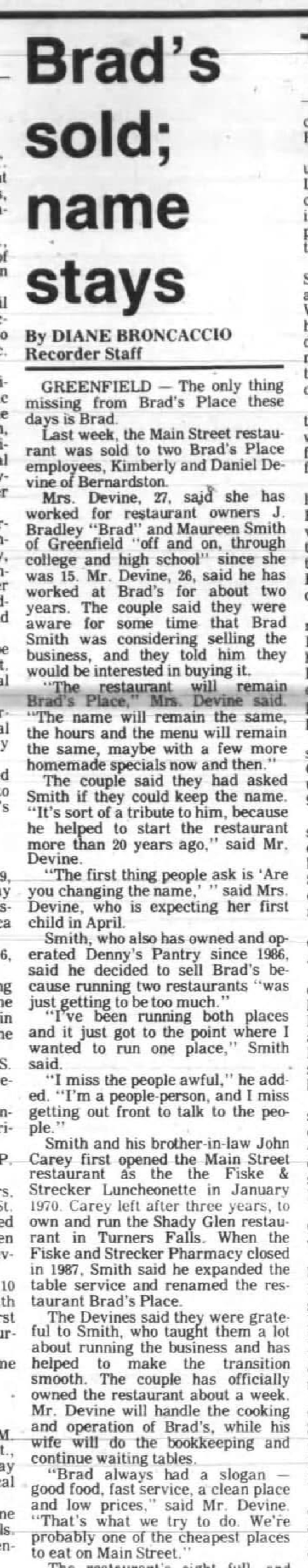 In 1990 after over 20 years of ownership, Brad Smith retired and passed the chef's hat and coffee pot to newlyweds Kim and Dan Devine, who have owned and operated Brad's Place ever since. This beloved family business is honored to be one of the longest standing downtown businesses serving our community great food, great conversation, and really great coffee! Find us on Main Street next to the Greenfield Garden Cinemas!